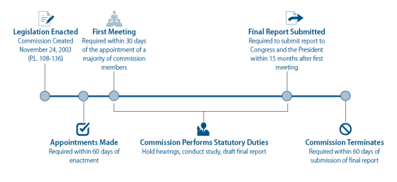 A congressional commission is commonly provided a series of deadlines that define major milestones in its statutory lifecycle. The overall amount of time provided to a commission to complete its work may vary substantially depending on how deadlines are constructed.