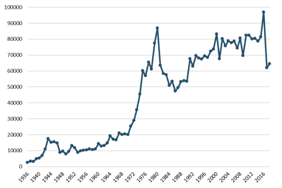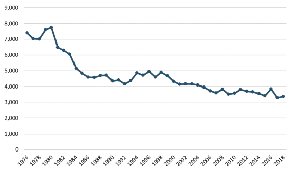 Source: Office of the Federal Register, Federal Register Documents Published 1976-2018, https://www.federalregister.gov/uploads/2019/04/stats2018Fedreg.pdf#page=4. |