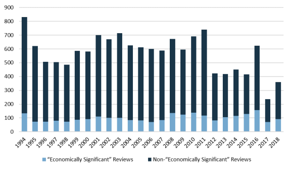 While the number of major rules is accessible on GAO's Database of Rules, the number of significant rules issued each year is not readily available. No requirement currently exists for agencies or other entities to keep track of how many significant rules are issued each year. However, data are available for the number of reviews at OIRA each year, because OIRA logs on its website each rule it received for review under E.O. 12866.53 Notably, the number of "significant" rules reviewed each year would not be the same as the number of "significant" rules issued each year: For example, a rule could be reviewed at OIRA late in one calendar year but not actually issued (i.e., published in the Federal Register) until the next calendar year. In addition, because OIRA reviews proposed and final rules, the total number of reviews is much higher than final rules issued each year. However, the number of reviews at OIRA each year can still give some idea of annual regulatory activity.54